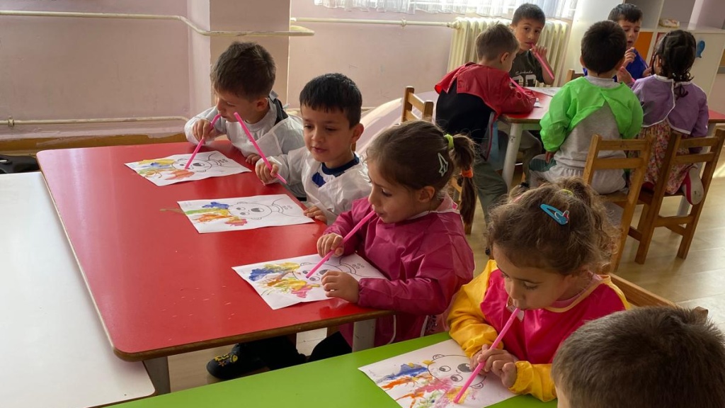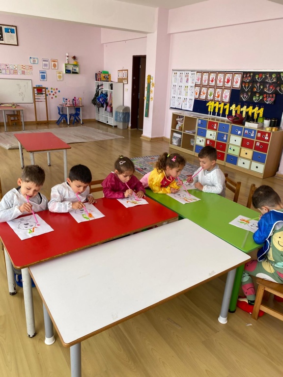 Anasınıfı öğretmenimiz ve öğrencilerimiz renkli bir etkinliğe imza attılar. Öğretmenimiz öğrencilerimize boş insan şablonu üzerinde renkli çalışmalarını yapmak üzere pipetleri dağıttı. Öğrencilerimiz boyalarını kullanarak pipetlerinden üflediler. Resim üzerinde değişik şekillerde saç stilleri oluşturarak çok eğlendiler. Öğrencilerimiz ortaya çok renkli etkinlikler çıkararak eğlenmiş ve öğrenmiş oldular.